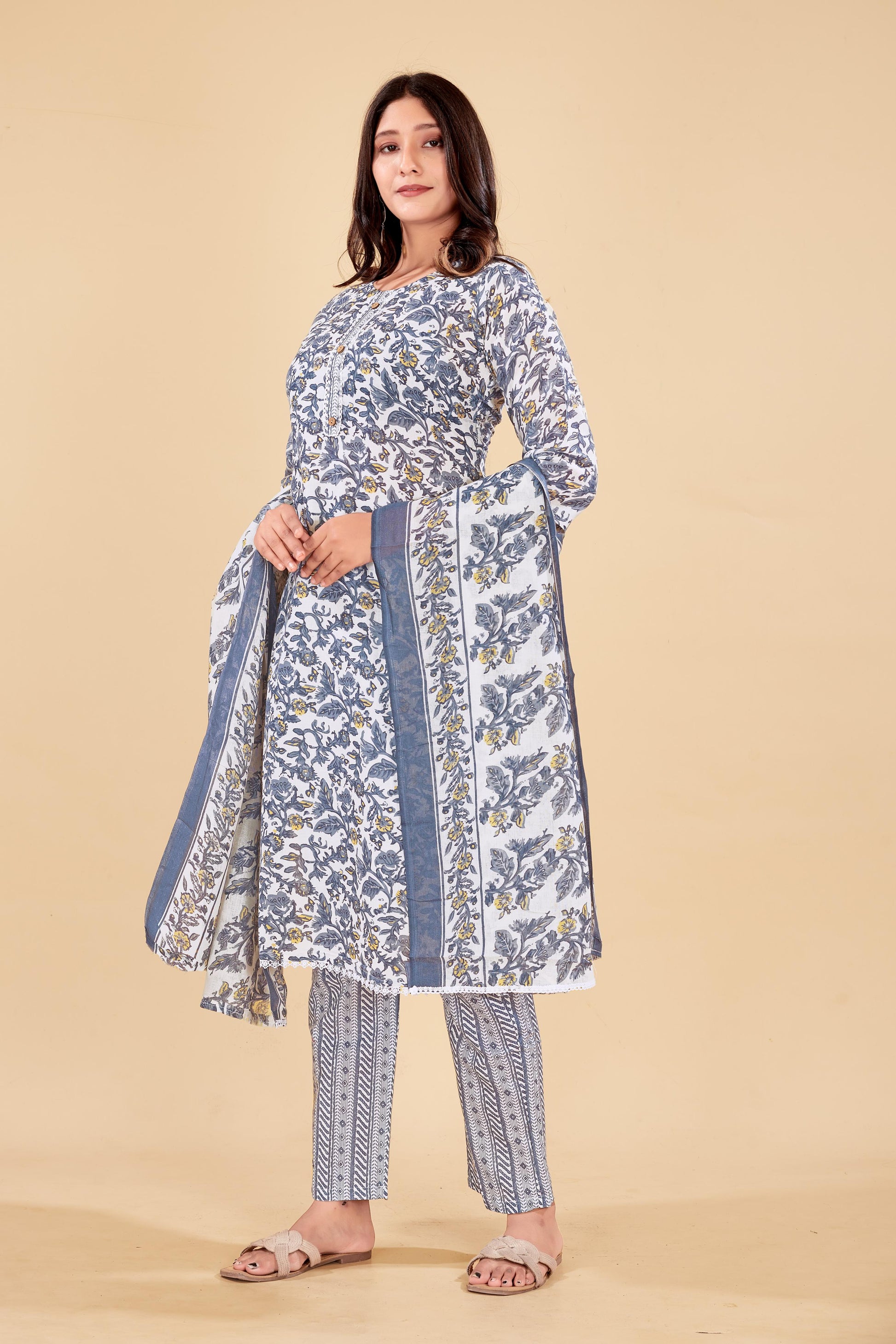Elevate your ethnic wardrobe with this beautifully crafted three-piece cotton kurta set, designed for both comfort and charm. The straight-cut kurta features an all-over floral print in soothing shades of blue and mustard, with delicate button detailing on the front. It is paired with striped and chevron-printed cotton pants, adding a contemporary twist to the traditional look. Completing the ensemble is a matching dupatta adorned with floral borders, enhancing the outfit’s graceful appeal.