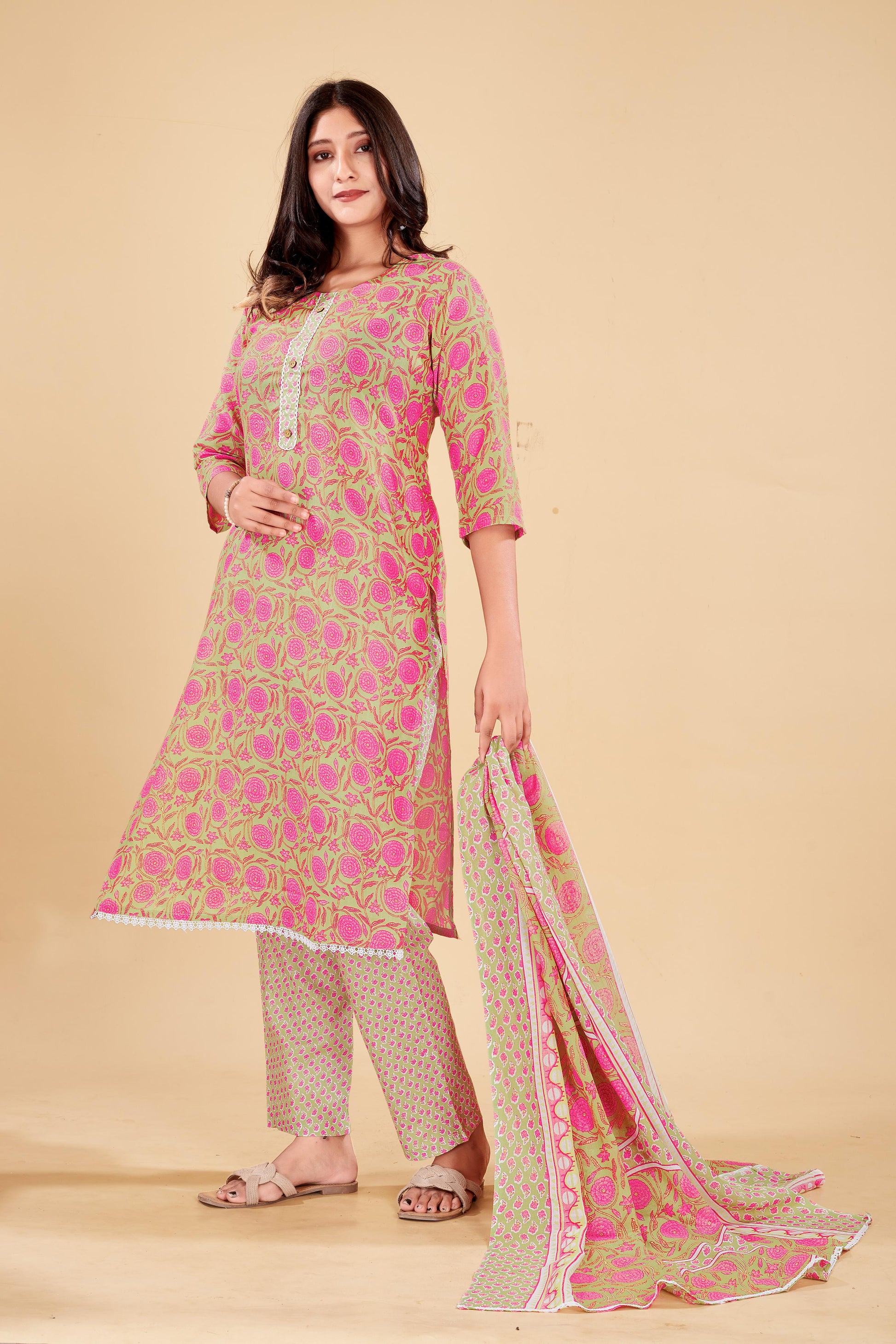 Step into grace with this serene pastel pink and green floral kurta set, designed to keep you stylish and comfortable all day. Crafted from breathable cotton, the kurta showcases bright pink rose motifs over a muted green base, complemented with lace detailing and a buttoned front placket. The matching printed cigarette pants and soft cotton dupatta complete this chic yet traditional ensemble.