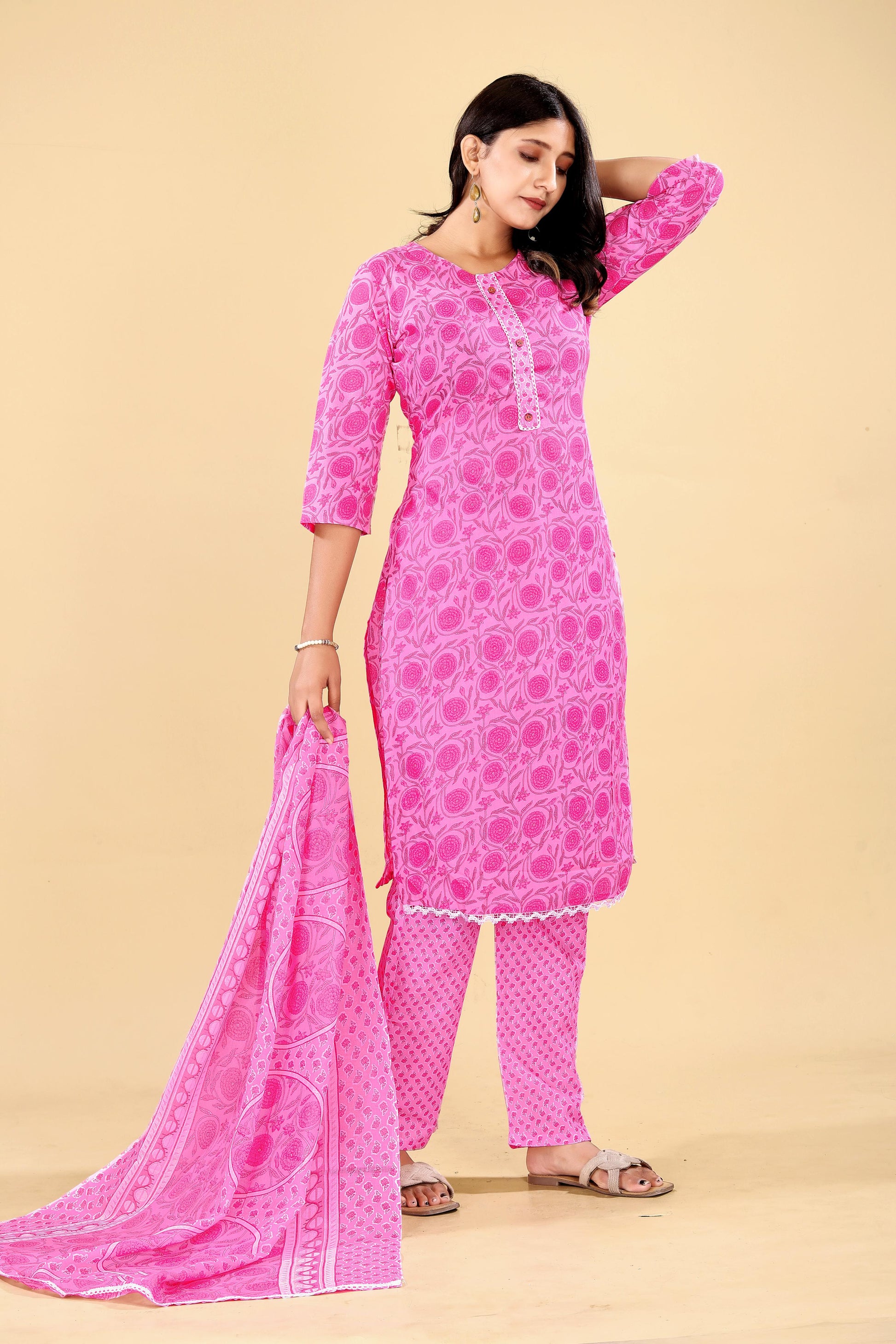 Step into elegance and everyday comfort with this three-piece pink cotton kurta set, designed to brighten your wardrobe. The kurta features an all-over floral block print in subtle contrast, highlighted with delicate lace trimming on the neckline and hem. It is paired with straight-cut pants adorned with a matching mini-print pattern and comes with a coordinated dupatta boasting a broad floral and geometric border for a complete ethnic charm.